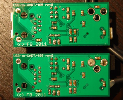 The FT232BL has a separate power rail for USB and I/O ports, so that it works with I/O at both 3.3V and 5V. This board uses a 3.3V linear regulator to generate the 3.3V supply from USB power, but that can be easily bypassed by shorting the Vin and Vout pins of the regulator. In this case, both the TTL UART and the 485 transceiver works at 5V.